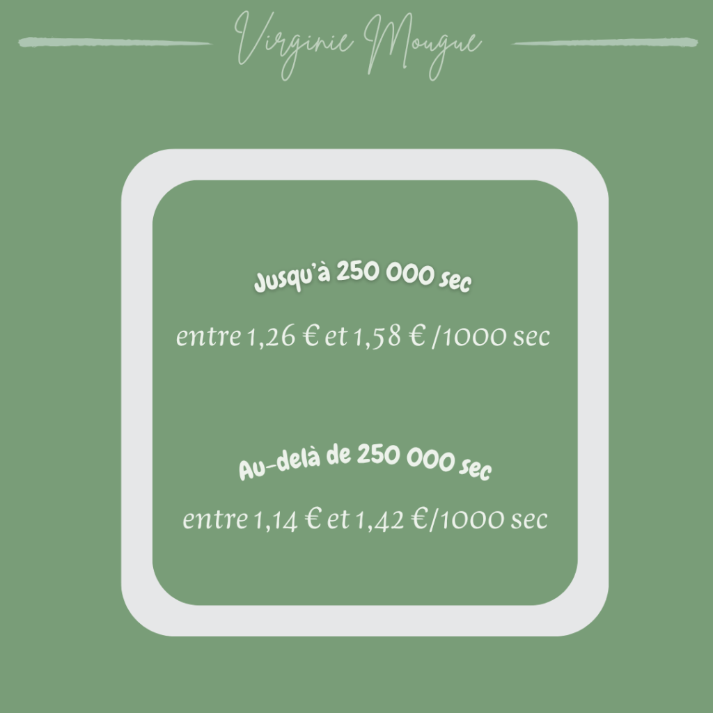 Pour chaque prestation, vous trouverez le prix minimal et le prix maximal. Le tarif est dégressif au-delà de 250 000 sec.